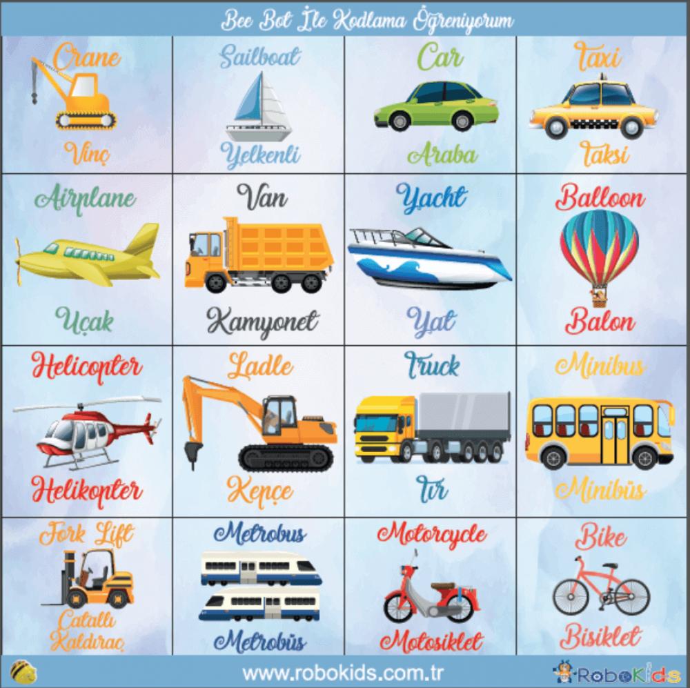- Çift Dilli Eğitim: Türkçe ve İngilizce taşıt isimleriyle çocukların dil becerilerini iki farklı dilde geliştirmesine yardımcı olur.