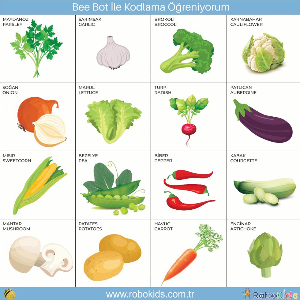 Mat üzerindeki renkli karelerde domates, patates, havuç, kabak, salatalık, soğan, sarımsak ve lahana gibi birçok sebze yer alır. Çocuklar Bee-Bot robotlarını bu sebze görselleri üzerine yönlendirirken yön kavramını, adım saymayı ve problem çözmeyi öğrenirler. Robokids
